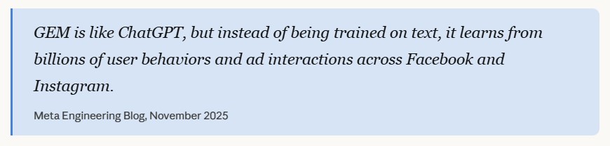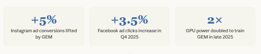 GEM is Meta’s answer: instead of tracking who a user is, it predicts what a user will do, using massive-scale behavioral modeling that does not rely on cookies at all. The infrastructure has now matured, and by 2026 it has become the foundation of Meta’s entire advertising business.